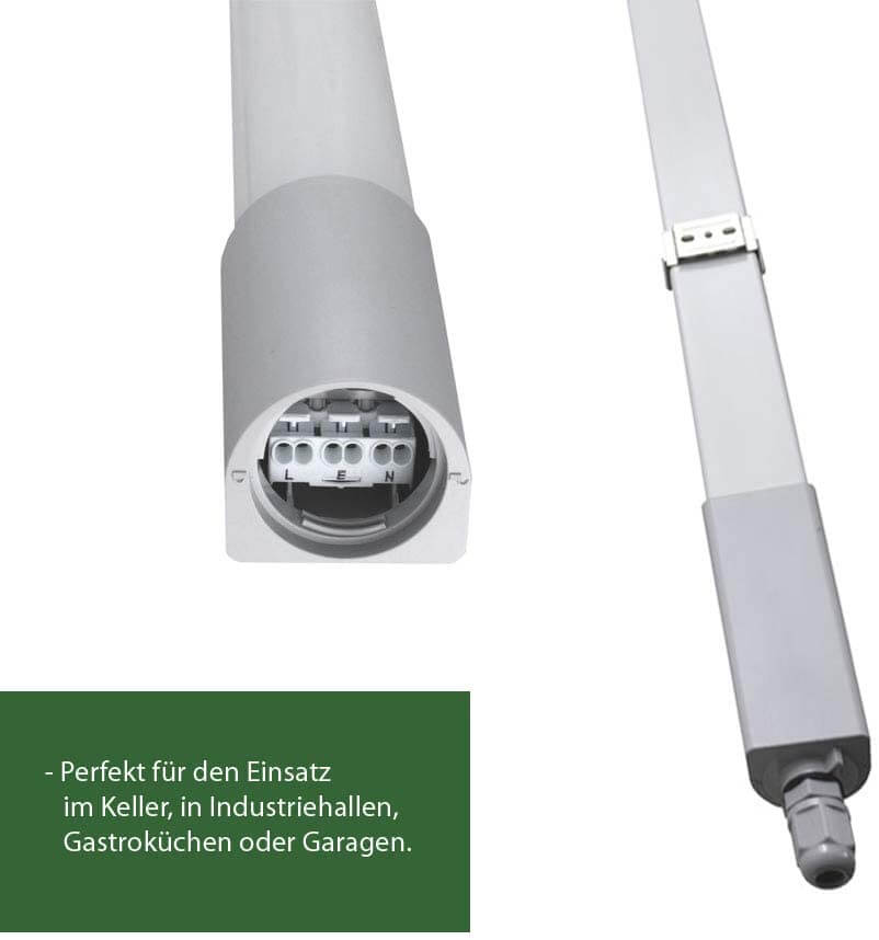 Die LED Leuchte bietet viele Anwendungsgebiete. Die LED Feuchtraumwannenleuchte ist z.B als Kellerleuchte, Garagenleuchte, Werkstattleuchte, Lagerleuchte, Badleuchte oder auch als Büroleuchte, für den Hobbyraum oder im überdachten Außenbereich einsetzbar. Die Leuchten können sowohl als Deckenleuchte als auch als Wandleuchte verwendet werden. Daher ist die LED Feuchtraumleuchte im privaten als auch im gewerblichen Bereich sehr vielseitig einsetzbar.